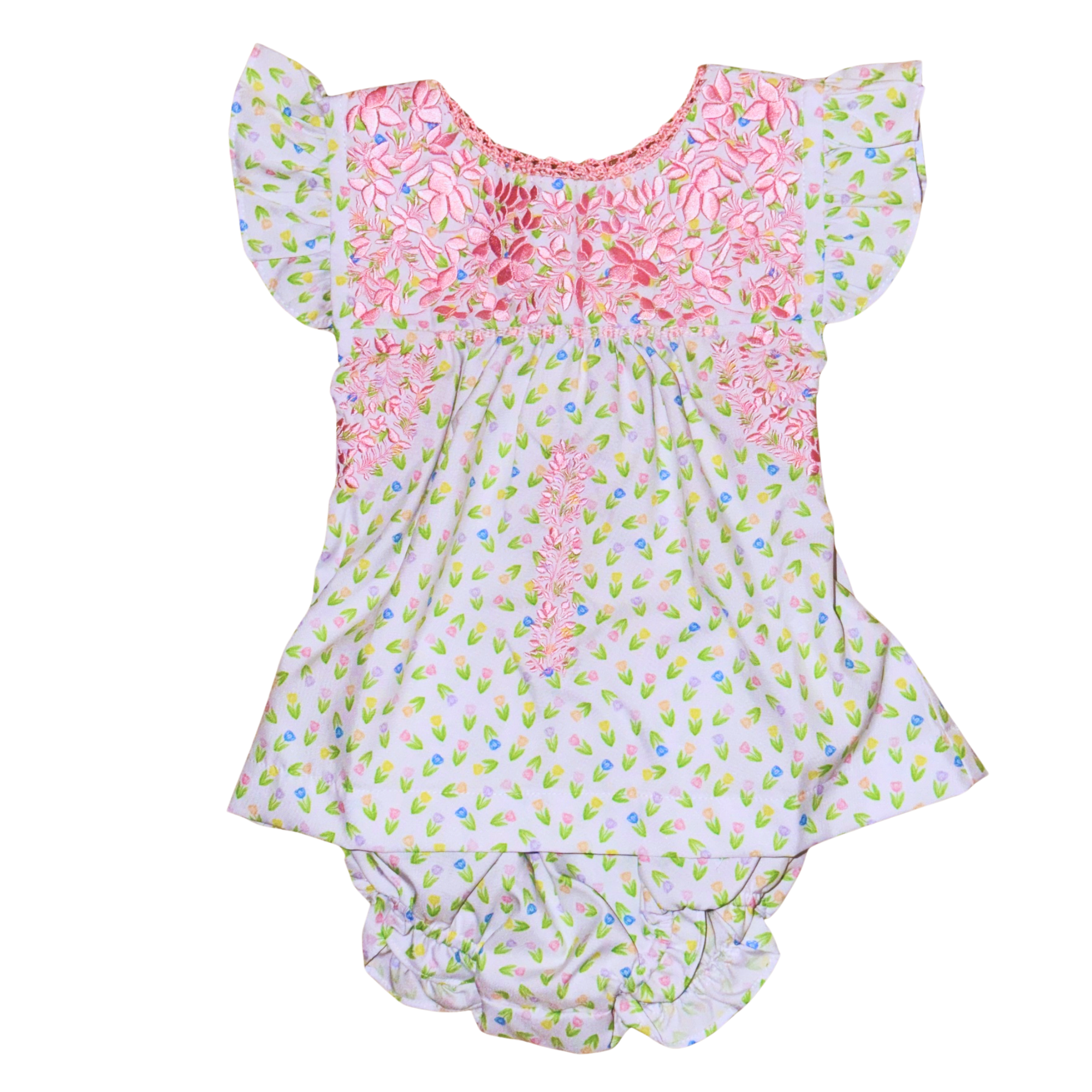 The Collins bloomer set features spring tulips with a soft pink matching embroidery. Your little one will look so sweet with playful flutter sleeves and matching bloomers.
