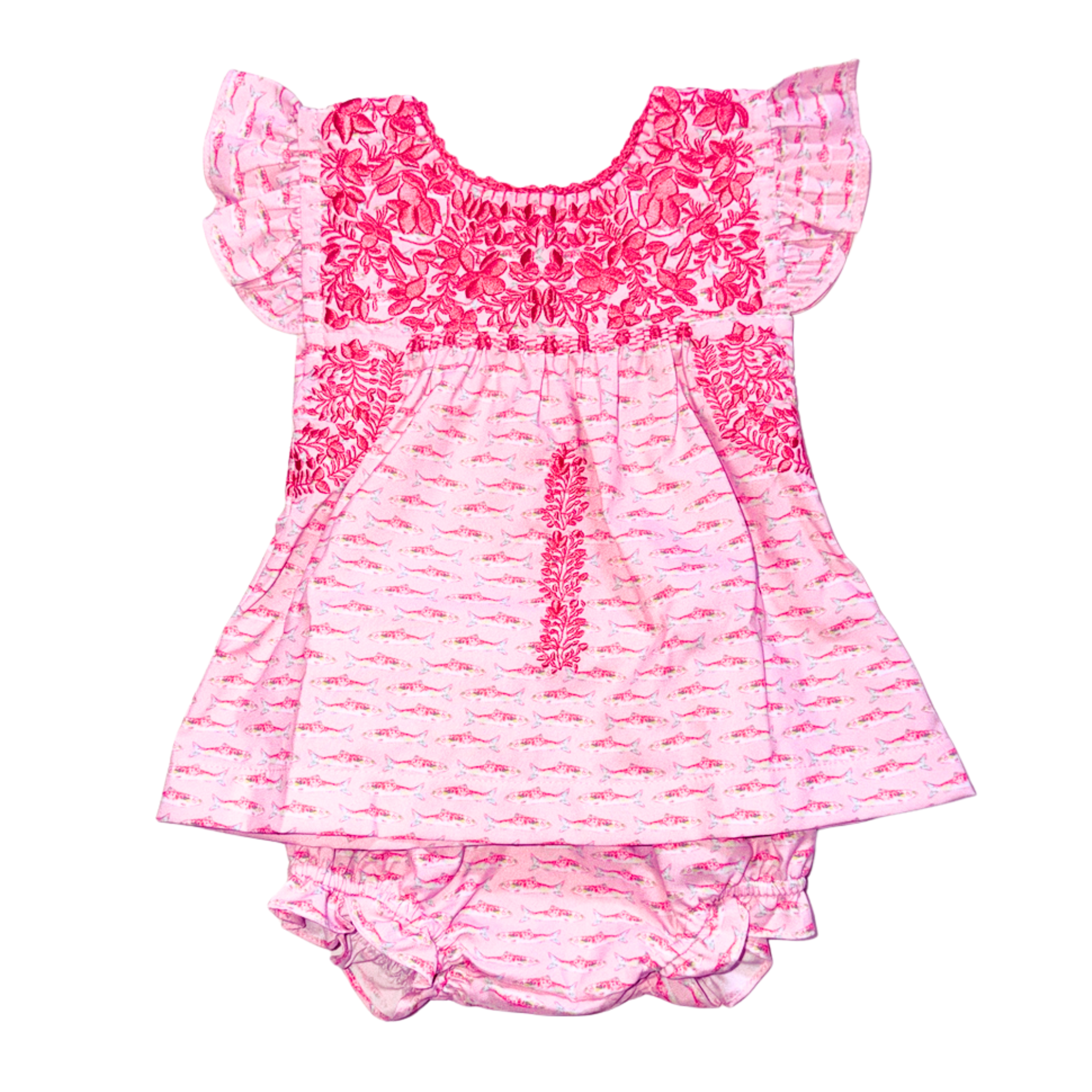 The Gone Fishing bloomer set is summer sweetness at its best. It's pink and breezy with playful fish details and beautiful embroidery. This bloomer set is perfect for sunny days and little adventures. Cute, comfy, and made for making memories!